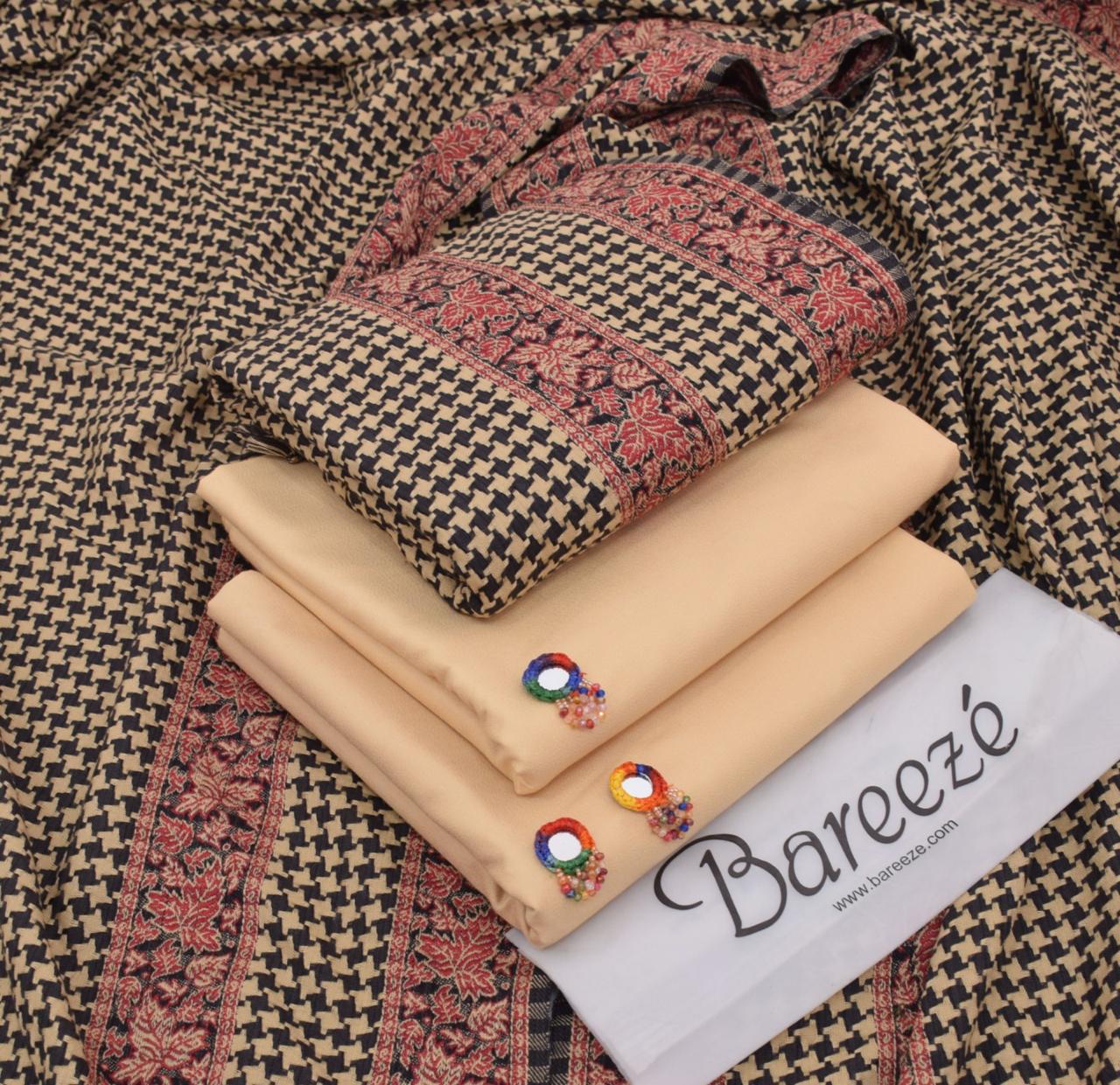 A graceful 3-piece Dhanak suit paired with a luxurious Pashmina shawl featuring rich textures and warm tones. Crafted for comfort and elegance, it blends traditional charm with winter warmth—perfect for festive gatherings or refined everyday wear.